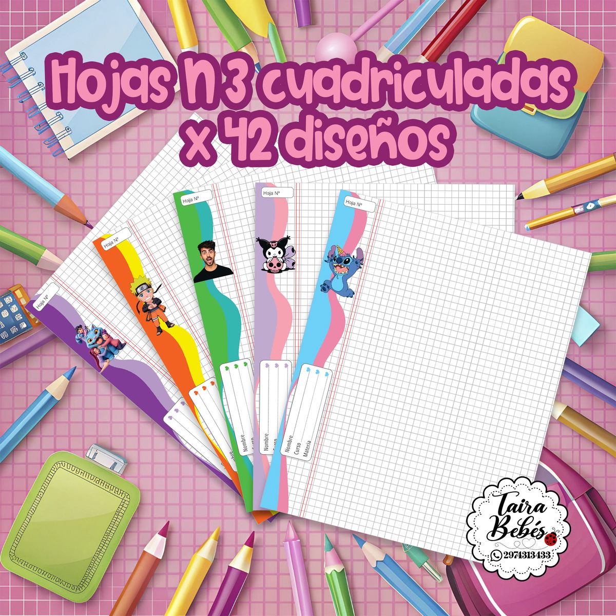 El pdf incluye 42 diseños de carpeta nº3 de hojas cuadriculadas